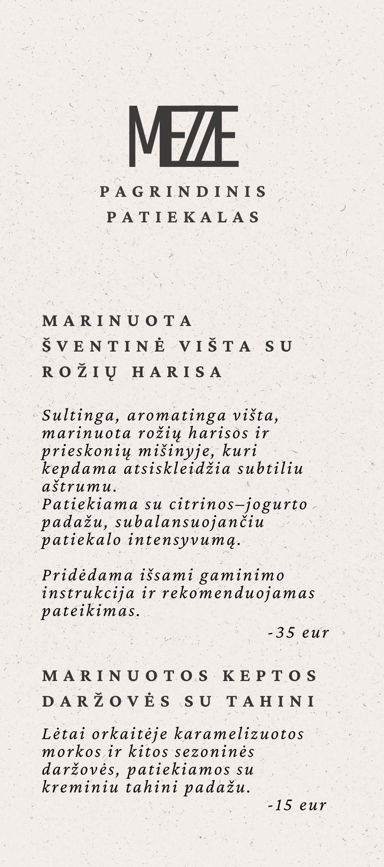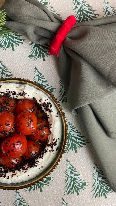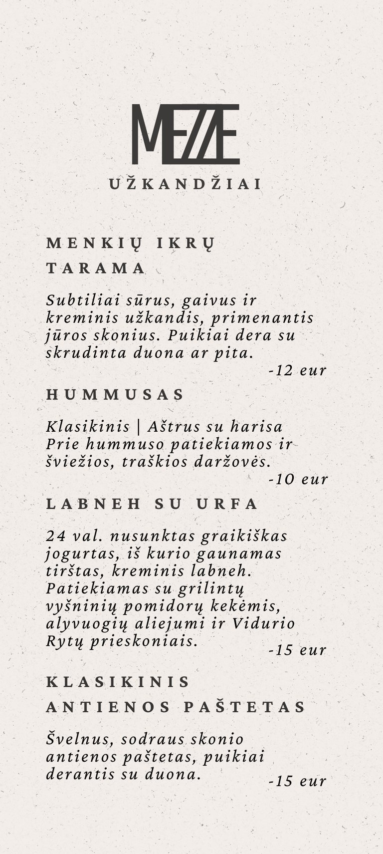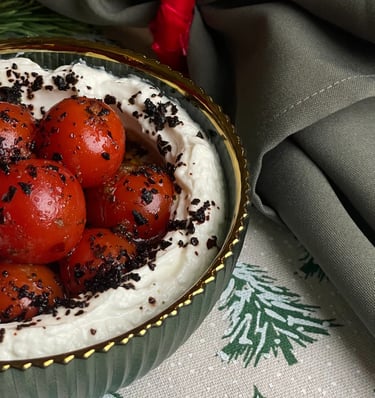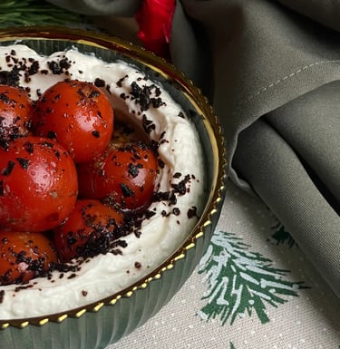 24 val. nusunktas graikiškas jogurtas, iš kurio gaunamas tirštas, kreminis labneh. Patiekiamas su grilintų vyšninių pomidorų kekėmis, alyvuogių aliejumi ir Vidurio Rytų prieskoniais.
