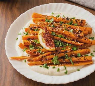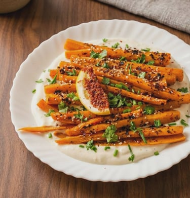Lėtai orkaitėje karamelizuotos morkos ir kitos sezoninės daržovės, patiekiamos su kreminiu tahini padažu.