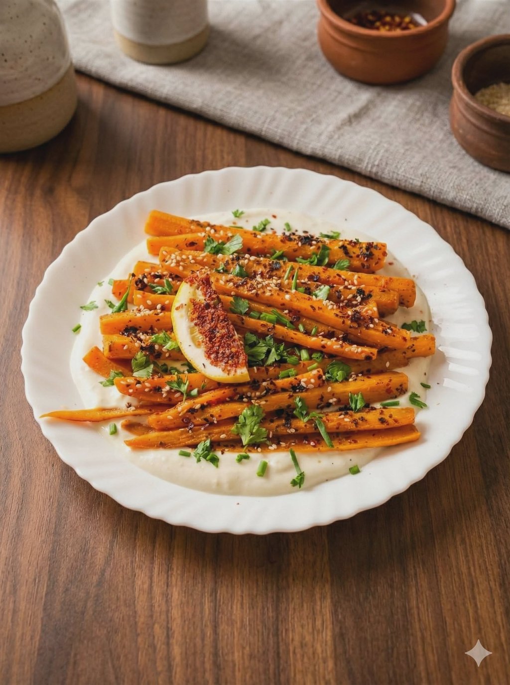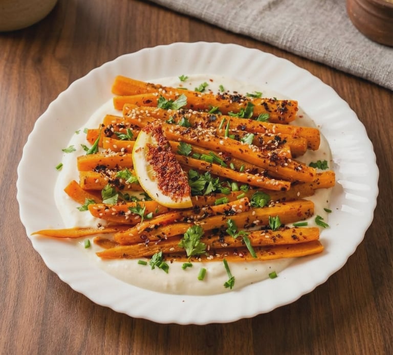Lėtai orkaitėje karamelizuotos morkos ir kitos sezoninės daržovės, patiekiamos su kreminiu tahini padažu.