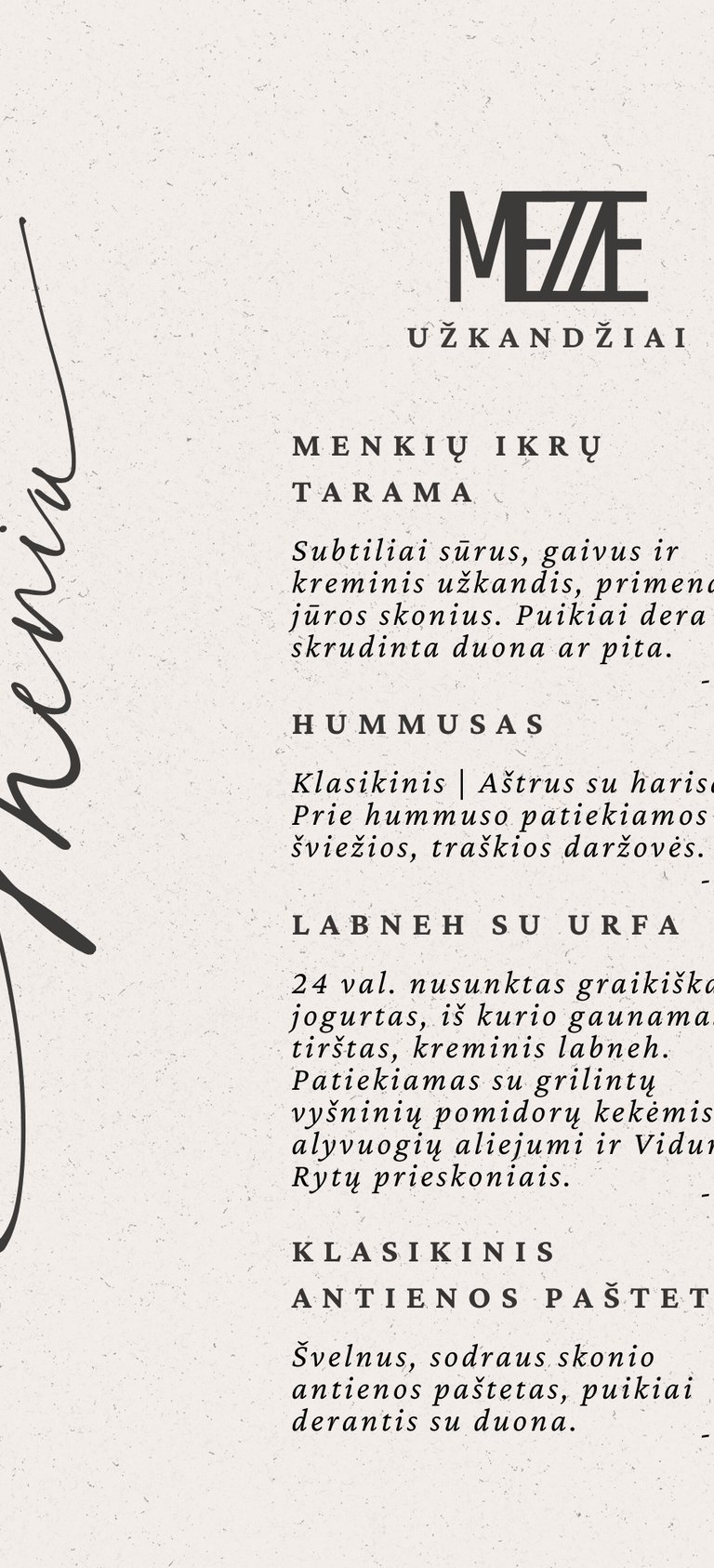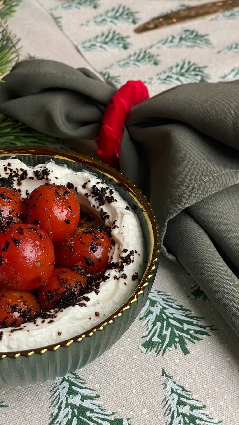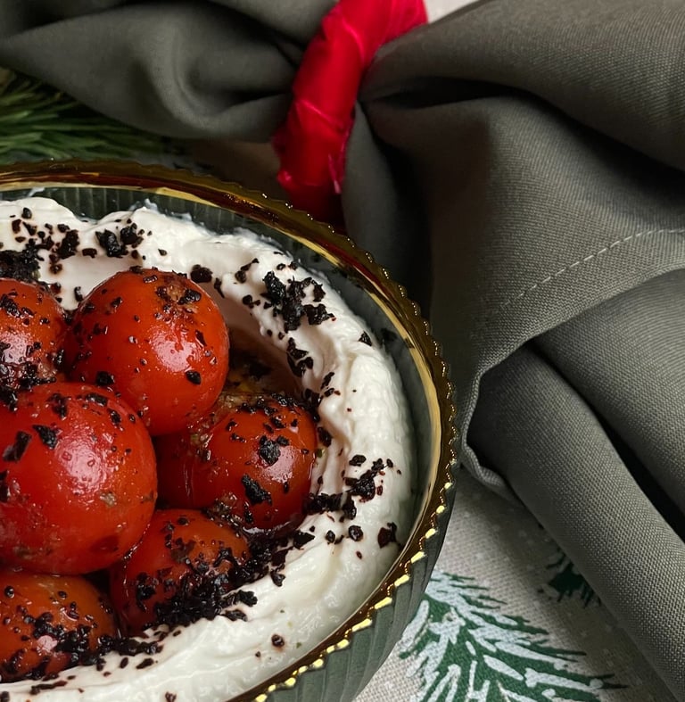 24 val. nusunktas graikiškas jogurtas, iš kurio gaunamas tirštas, kreminis labneh. Patiekiamas su grilintų vyšninių pomidorų kekėmis, alyvuogių aliejumi ir Vidurio Rytų prieskoniais.