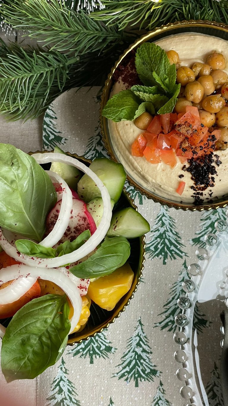 Klasikinis avinžirnių užkandis su tahini ir alyvuogių aliejumi.